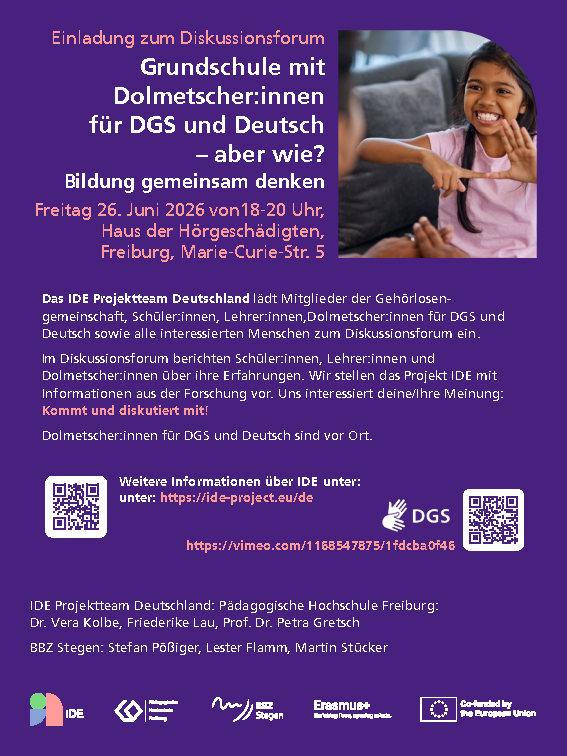 Aktuell freuen wir uns darüber Sie zum Diskussionsforum “Grundschule mit Dolmetscher:innen für DGS und Deutsch - aber wie? - Bildung gemeinsam denken” am 26.6.26 von 18.00 - 20.00 Uhr ins Haus der Hörgeschädigten Freiburg einladen zu können. Weitere Informationen finden Sie im angehängten Flyer. Wir freuen uns auf Ihr Kommen!
