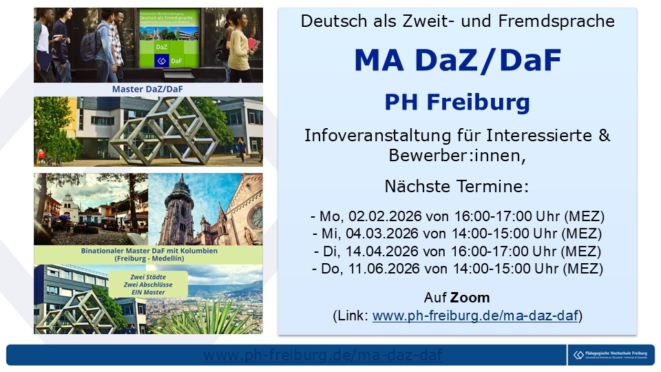 Neben dem nationalen MA DaZ/DaF bietet die PH Freiburg auch die Möglichkeit, einen binationalen MA DaF (Deutsch als Fremdsprache) mit Doppelabschluss in Kooperation mit der Universidad de Antioquia in Medellín/Kolumbien zu studieren. Weitere Informationen zum binationalen Masterstudiengang DaF