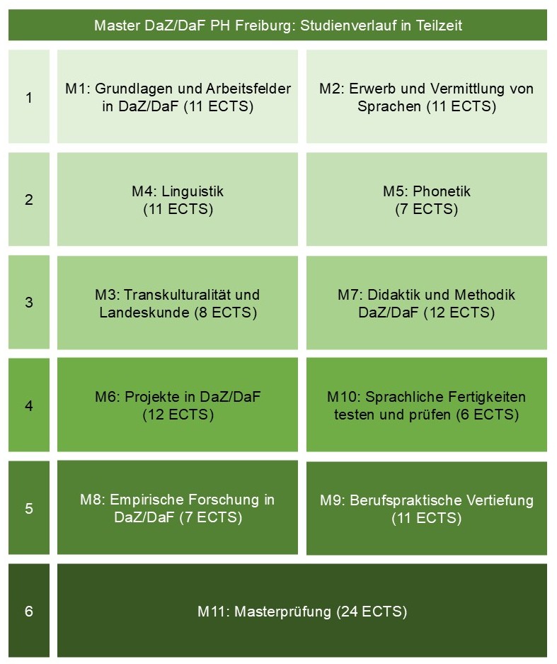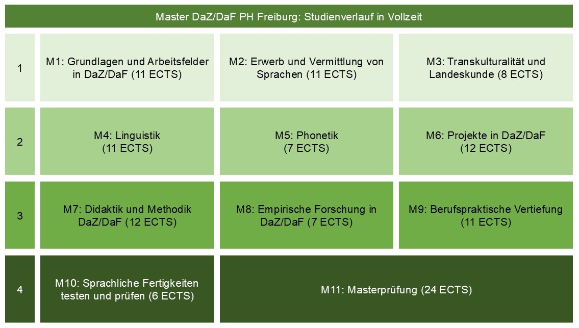 Der Masterstudiengang Deutsch als Zweitsprache/Fremdsprache (ab WiSe 2022/2023) besteht aus elf Modulen mit insgesamt 120 ECTS-Punkten.